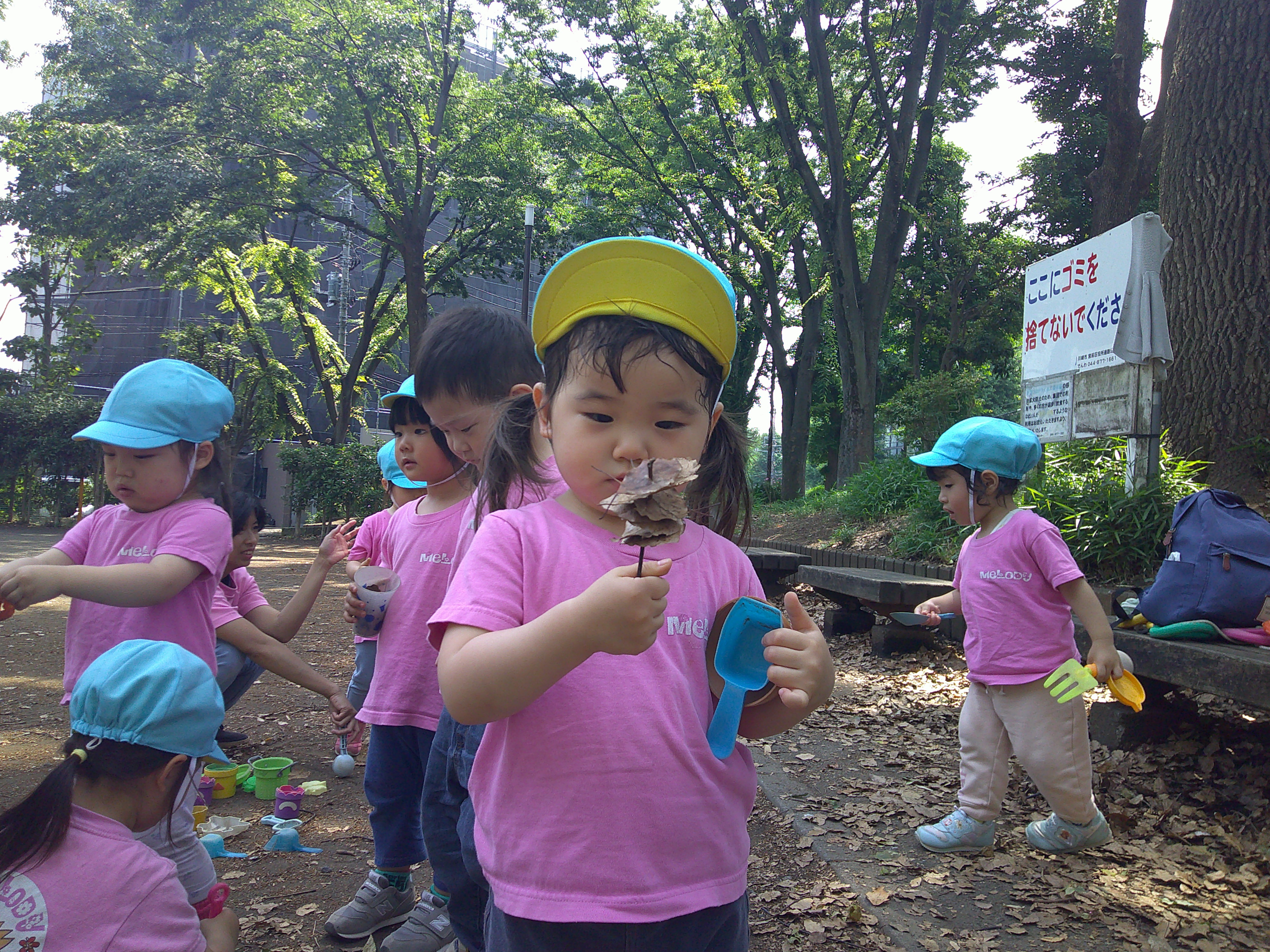 Let's go to Dai-2 Park. We played with bubbles. We run on a number 8 direction. We scooped some sand and dried leaves. We found a centipede walking on the ground.