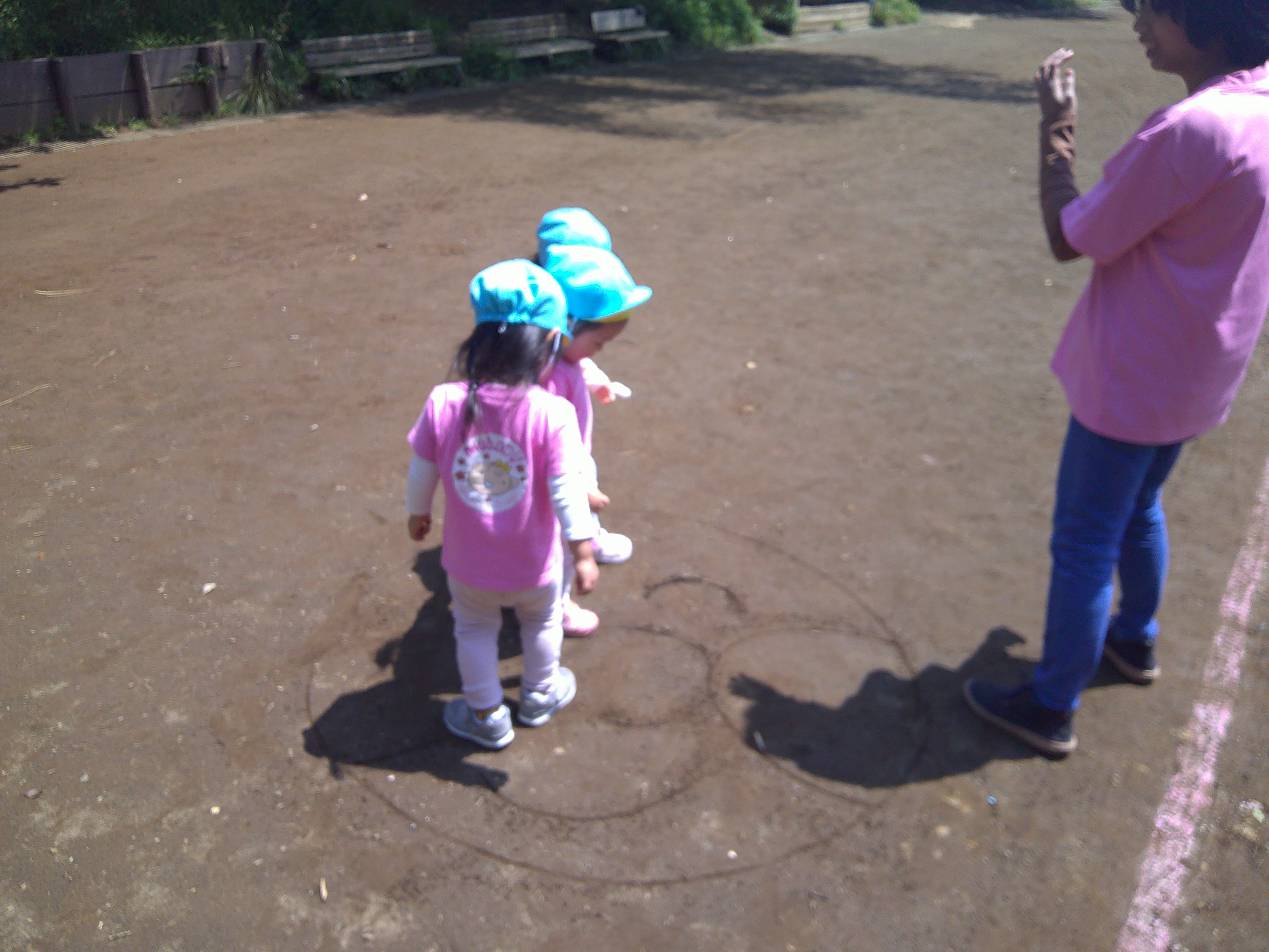 It was sunny and hot today. All team went to the park. There were many kids from the other kindergarten too. We played near the fence and we run around it for many times. We gathered some fallen cherry fruits and dried leaves. We chased and popped some bubbles too. We found a big hole on the ground which we believed it was an ants house. Some Panda team kids are able to run and walk for a long time. They like copying what the Rabbit kids doing.